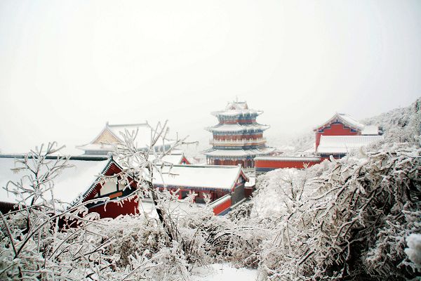 順著路一直走走拍拍,連不愛照相的俺都忍不住吆喝著來一張來一張。俺兄弟一邊拍一邊不惜余力地打擊俺:您老就別糟踐這美景了。走在鬼谷棧道,一側(cè)是山壁,一側(cè)是霧氣籠罩的懸崖,后來又下起雪來,真有點(diǎn)深山求仙的味道。其實(shí)一路走來并不累,就是總不得不從被冰掛壓倒的樹下鉆身而過,累得腰酸。再有就是俺一度說要雪盲了,眼睛都有點(diǎn)發(fā)花。最后終于到了頂端的天門山寺。確實(shí)要承認(rèn),在這樣的一番情景之下,佛性也顯得格外深沉,連那個向來不信的家伙也雙手合十。本來還想隨喜瞻仰一下佛祖真身舍利的,可被那個賣票的痞子樣給雷到而作罷。